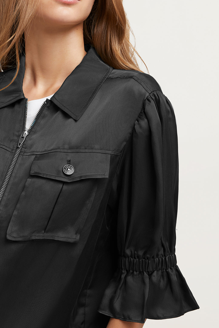 Experience comfort and style with the Holly Jacket. This short-sleeved jacket features a collared neckline and sleek black design, perfect for any occasion. Made with cupro fabric and complete with an exposed zipper and patch pockets, it's the perfect combination of fashion and functionality.
