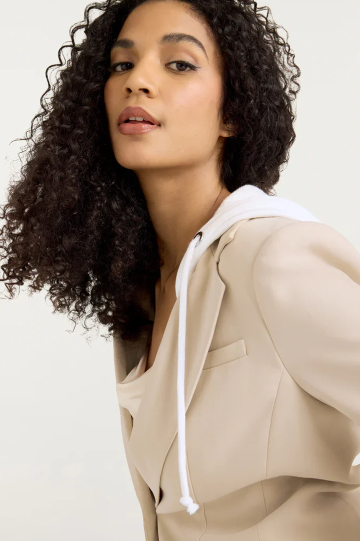 Be ready for any occasion in the Hooded Khloe Blazer. Crafted with Drapey Crepe, a french terry underlay, and a drawstring hood, it's designed to flatter your silhouette. The hood and stylized sleeves add a touch of unique style. Stand out—make a statement in the Hooded Khloe Blazer.