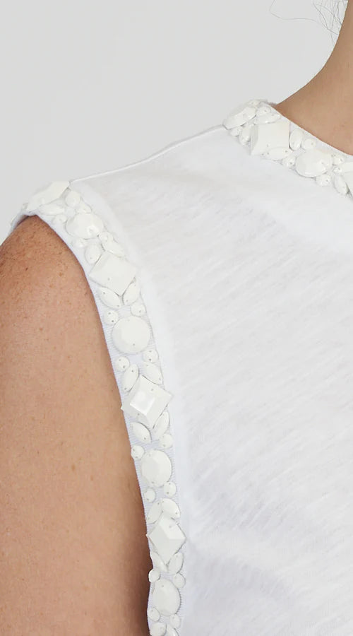 - Sleeveless, beaded trim at armholes