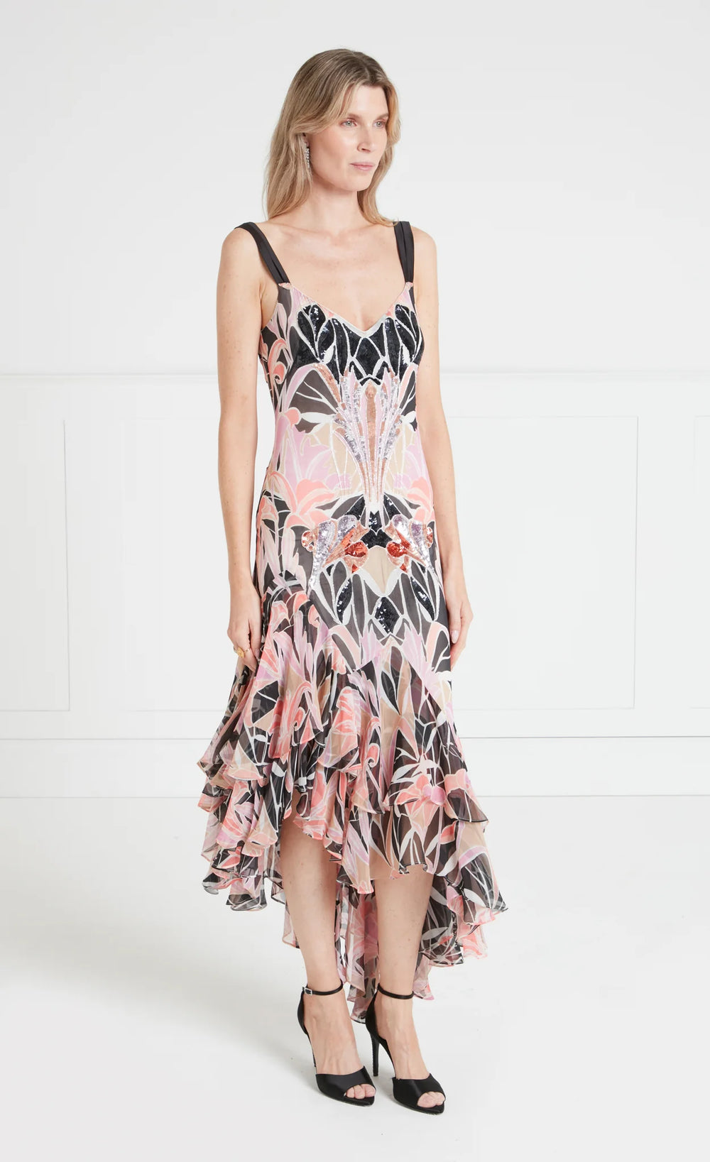 The Alani Ruffle Dress is a slip-style silhouette with a fluid, asymmetric ruffle skirt crafted from a semi-sheer, printed georgette. Blending modern design with the elegance of traditional flamenco dresses, the ruffles offer movement and playfulness with subtle texture and sparkles.