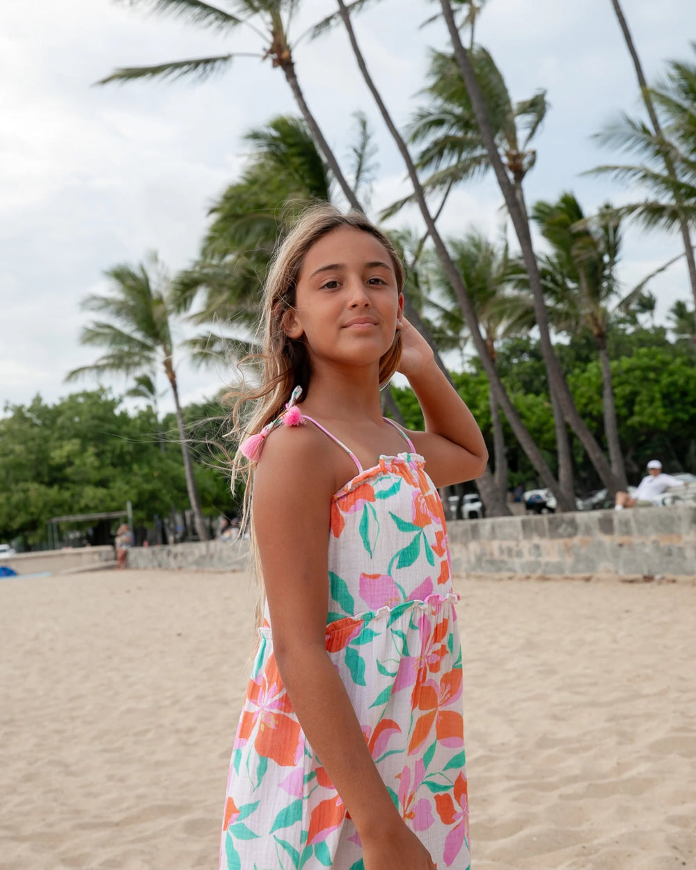Girl's maxi dress with elastic ruffle detail around chest, contrast tassel detail on straps, perfect swim cover-up. Matching Mom and mini style.