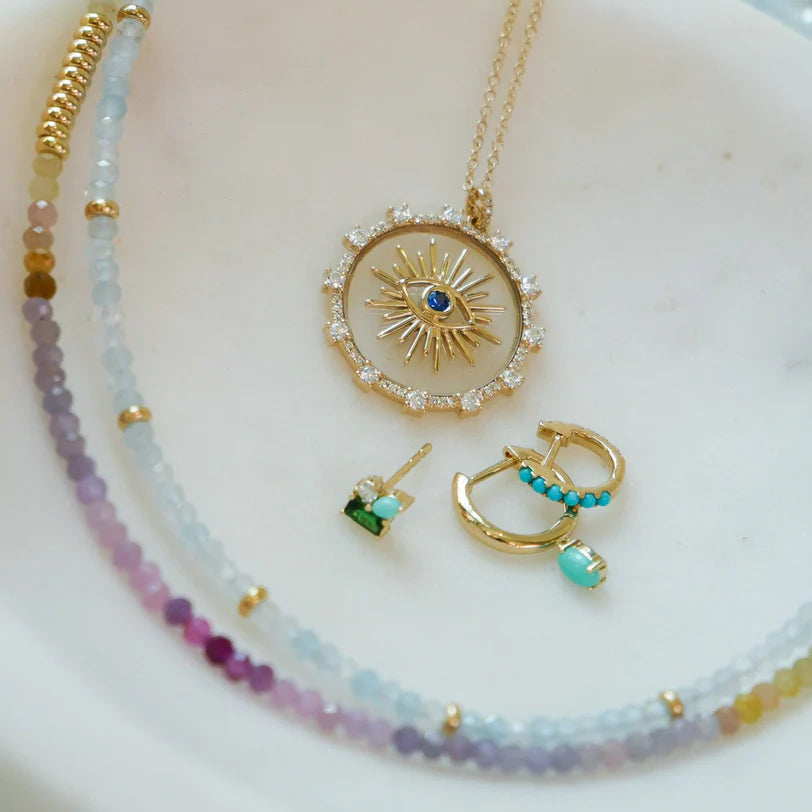 The Triple Treasure Stud Earring features a cluster of sparkling gems. Get colorful with this cool-toned baguette emerald, round diamond, and marquise turquoise stud.