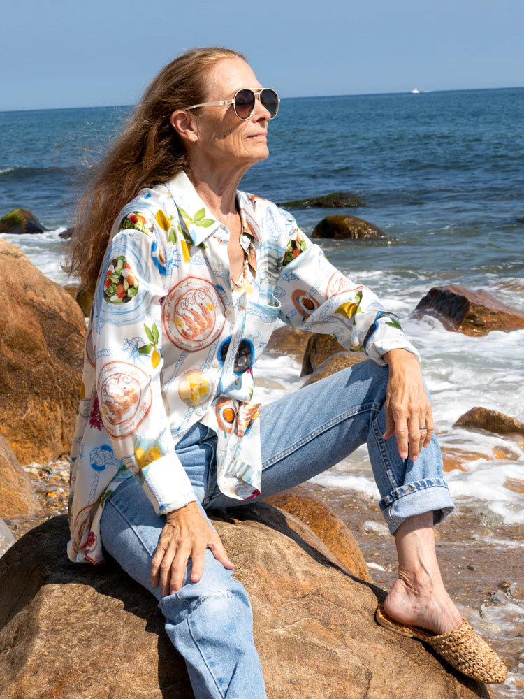 Lampi Fish Tavern, located on the beautiful pebbled beach of Lampi in Patmos, is one of my all-time favorite spots for lunch. I’ve spent countless hours here with friends and family, enjoying drinks, laughter, and the freshest catch of the day. Their specialty? The irresistible flaming halloumi cheese! This print was hand-painted from a photo I took of my table there last summer, capturing all the essentials of a perfect Greek lunch. xo Rachelle