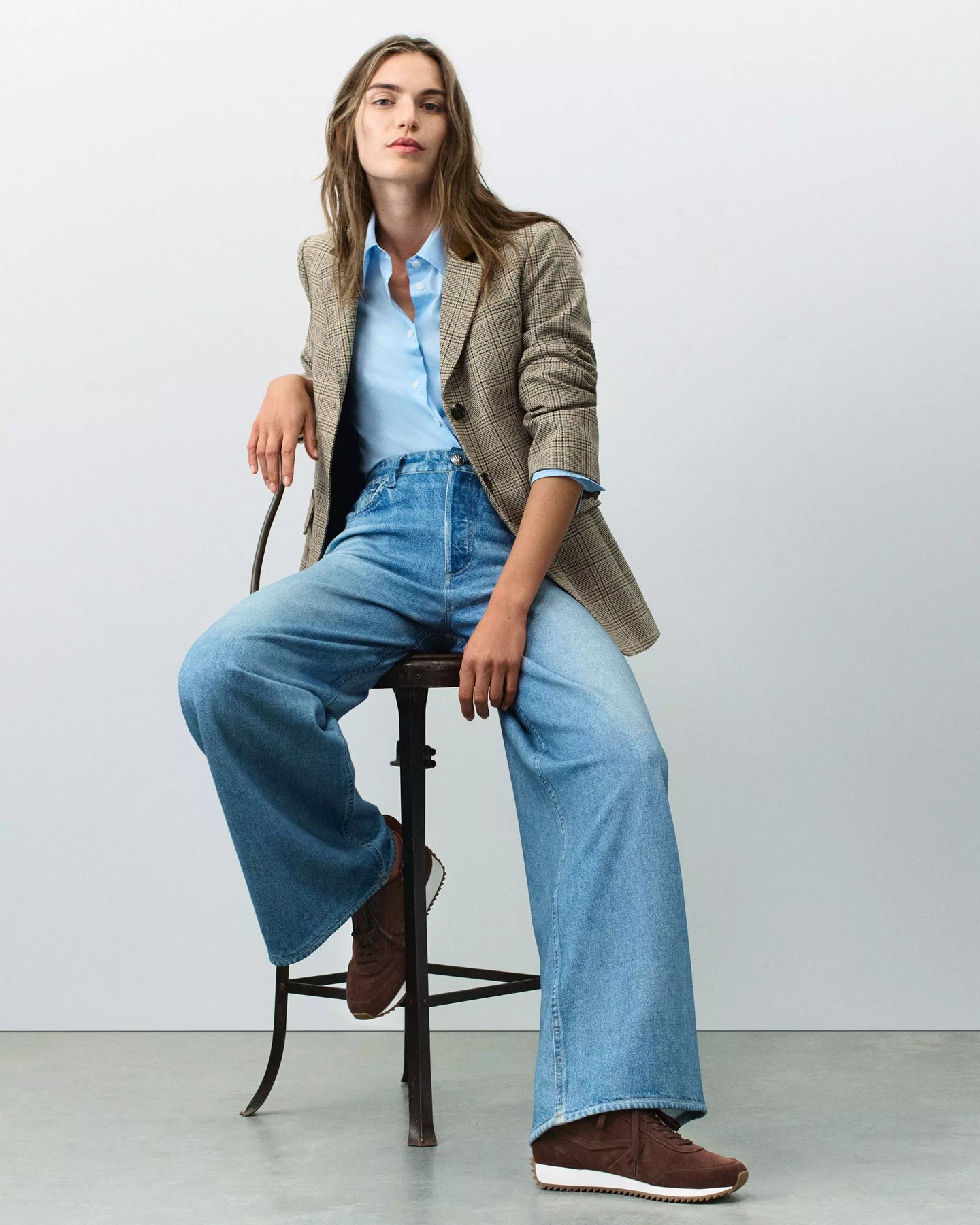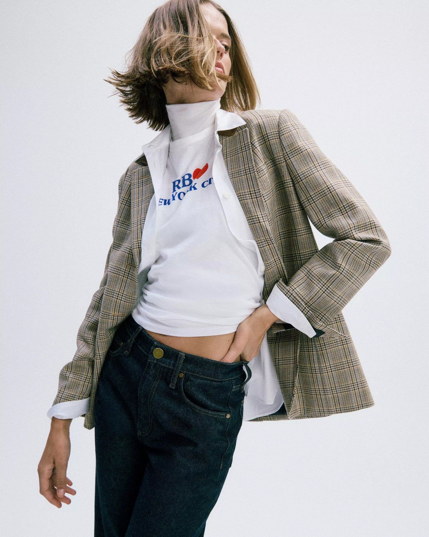 Heritage roots. Modern attitude. Tailored from a soft wool blend in a custom plaid, this three-button blazer features faux suede trims and a relaxed, slightly longer silhouette. Make it a full suit with the matching Shea Plaid Pants, or keep it casual with jeans. This style runs large, so for the closest fit, consider sizing down.