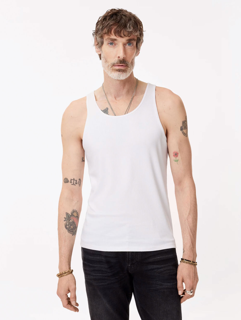 The Olin Classic Rib Tank, essential for Spring '25, features rib construction with a flat back interior for a soft feel against the skin and shape retention. Tailored with forward shoulder seams and self-fabric binding at the neck and armholes, this tank is subtly enhanced with our signature peace sign embroidery.