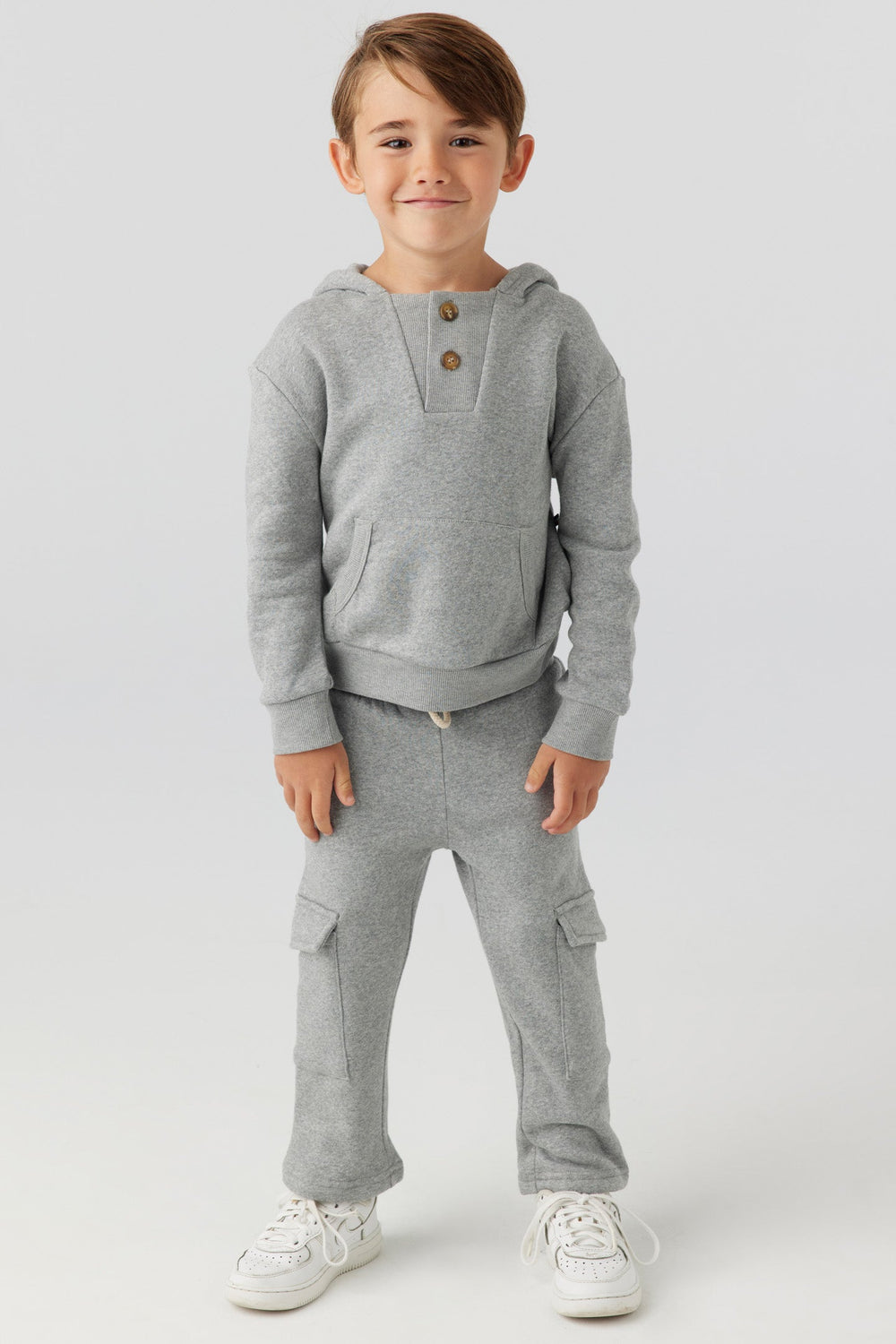 A Sol Angeles essential fit with a vintage collegiate design featuring a unique rib inset button placket at collar and kanga pocket with rib trim at pocket openings.