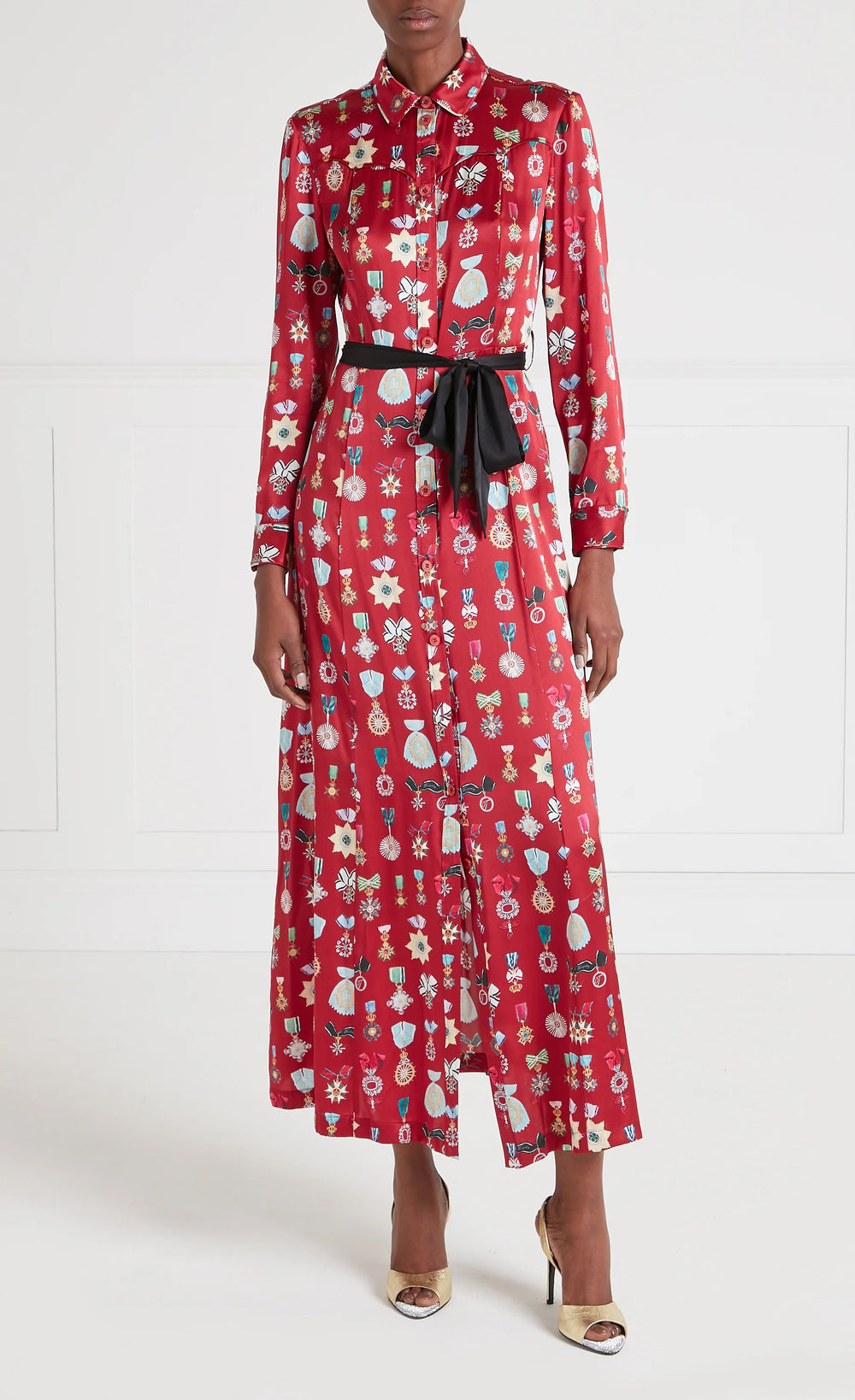 Versatile and elegant, the Gloriette shirt dress is crafted from a silk satin, designed with long sleeves, a button-through front, and a flowing skirt. Featuring a detachable sash belt to cinch the waist.