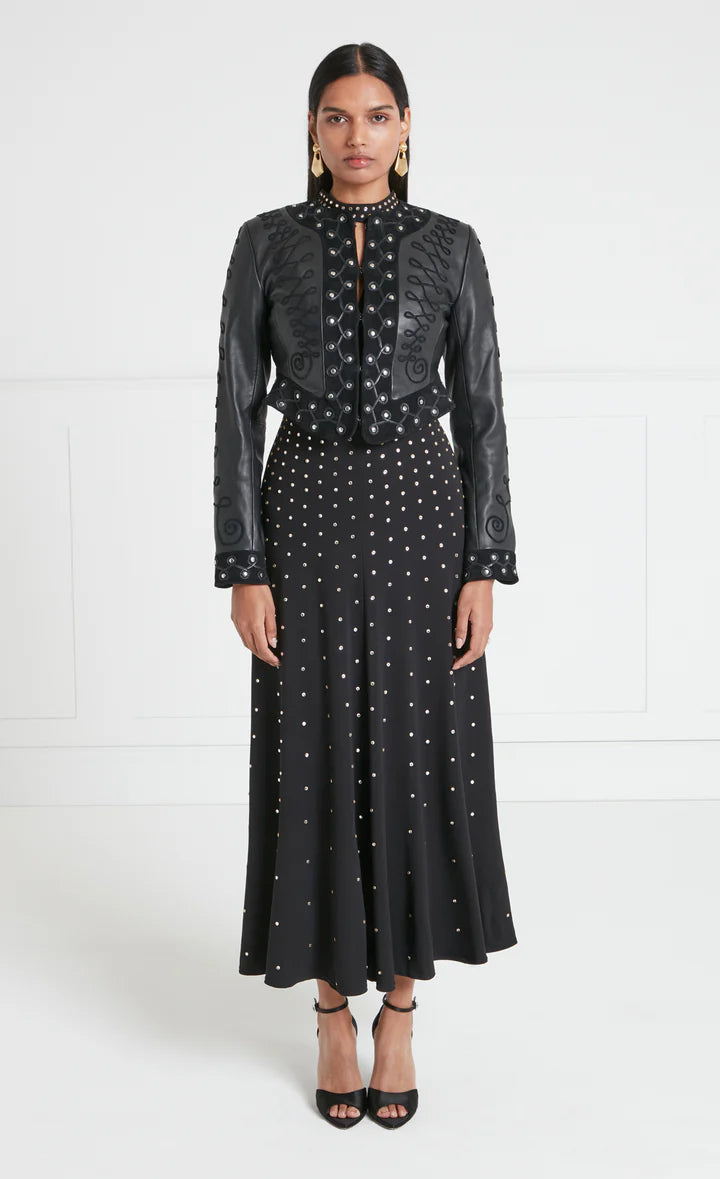 The cropped Pablo leather jacket is a statement piece, adorned with intricate embroidery, studwork, and elegant cording that showcase exceptional craftsmanship of soft sheepskin leather and suede.