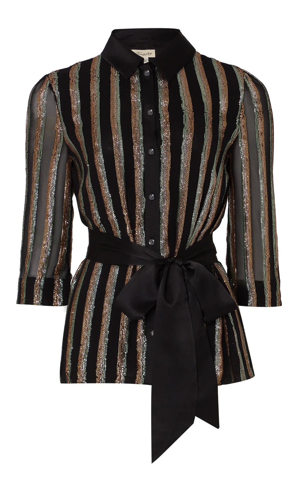 A modern take on occasion dressing, the Selena Shirt is embellished with vertical striped sequins that bring a soft, light-catching shimmer. The satin placket, collar, and belt add polish and contrast, elevating the silhouette with luxurious textures.
