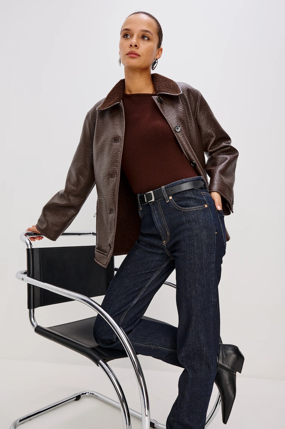 Luxurious warmth meets elevated style in the Luis. Constructed from sumptuous vegan pebbled leather with a plush faux-shearling collar and lining, this sophisticated jacket features front button closures and zippered side pockets with O-ring pulls for a refined finish.
