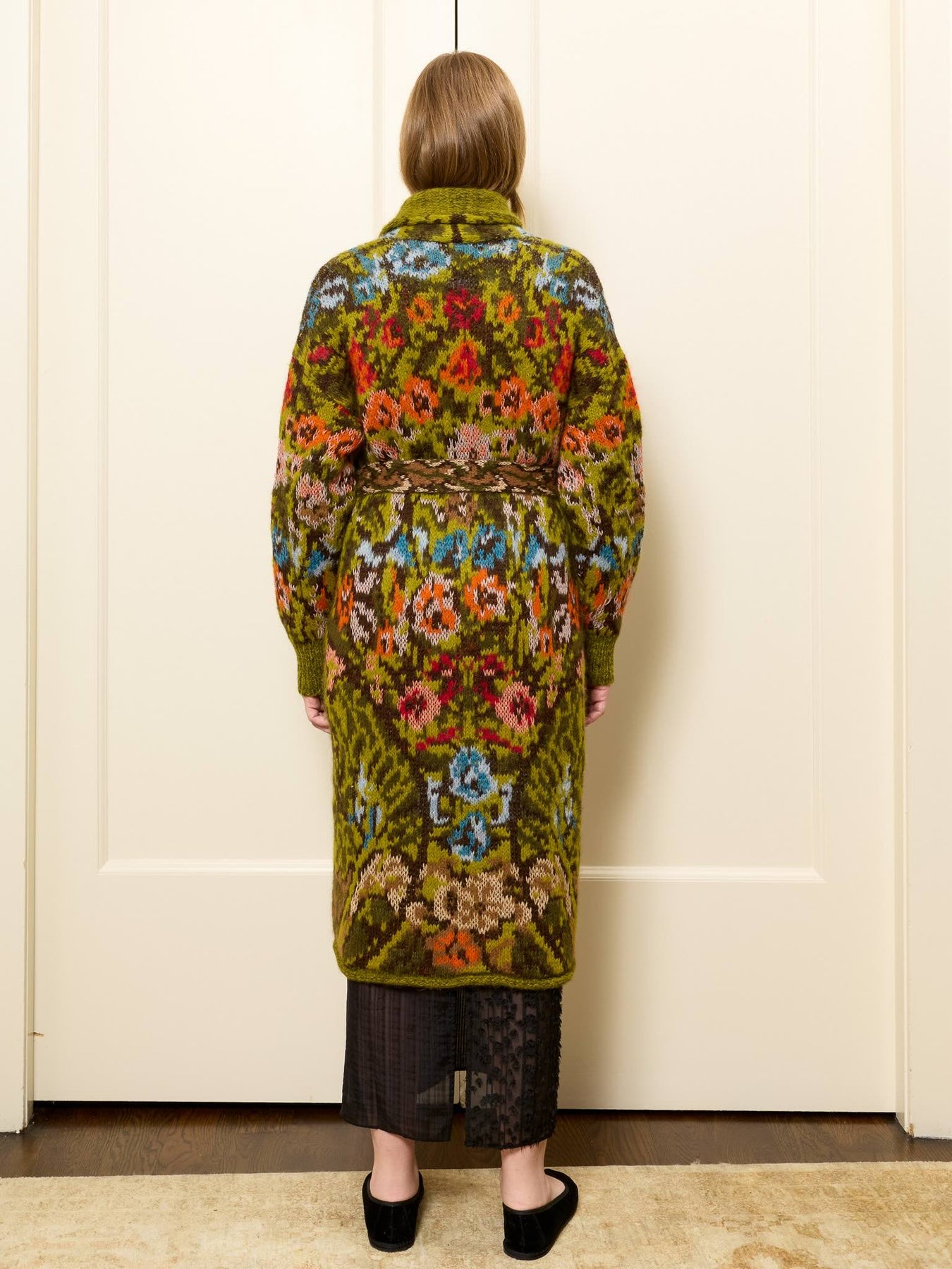 The Molly Robe features a rug-hooking-inspired jacquard floral pattern, bringing texture and tradition into a classic robe silhouette. Designed with an oversized fit, it drapes effortlessly and cinches at the waist with a self-tie belt for versatile styling. Cozy yet refined, it’s the perfect layer for lounging at home or stepping out. Worn by the iconic Molly Ringwald.