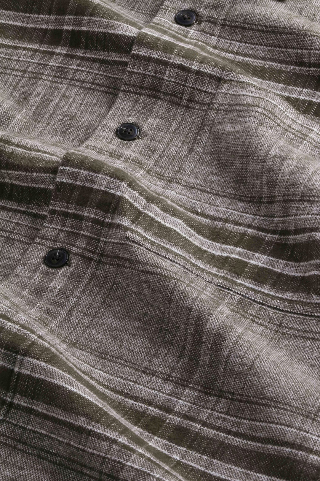 Overshirt constructed for a boxy, relaxed fit crafted in an organic cotton brushed flannel fabric. Featuring a square patch pocket, imitation horn buttons, and a nifty hanging loop.