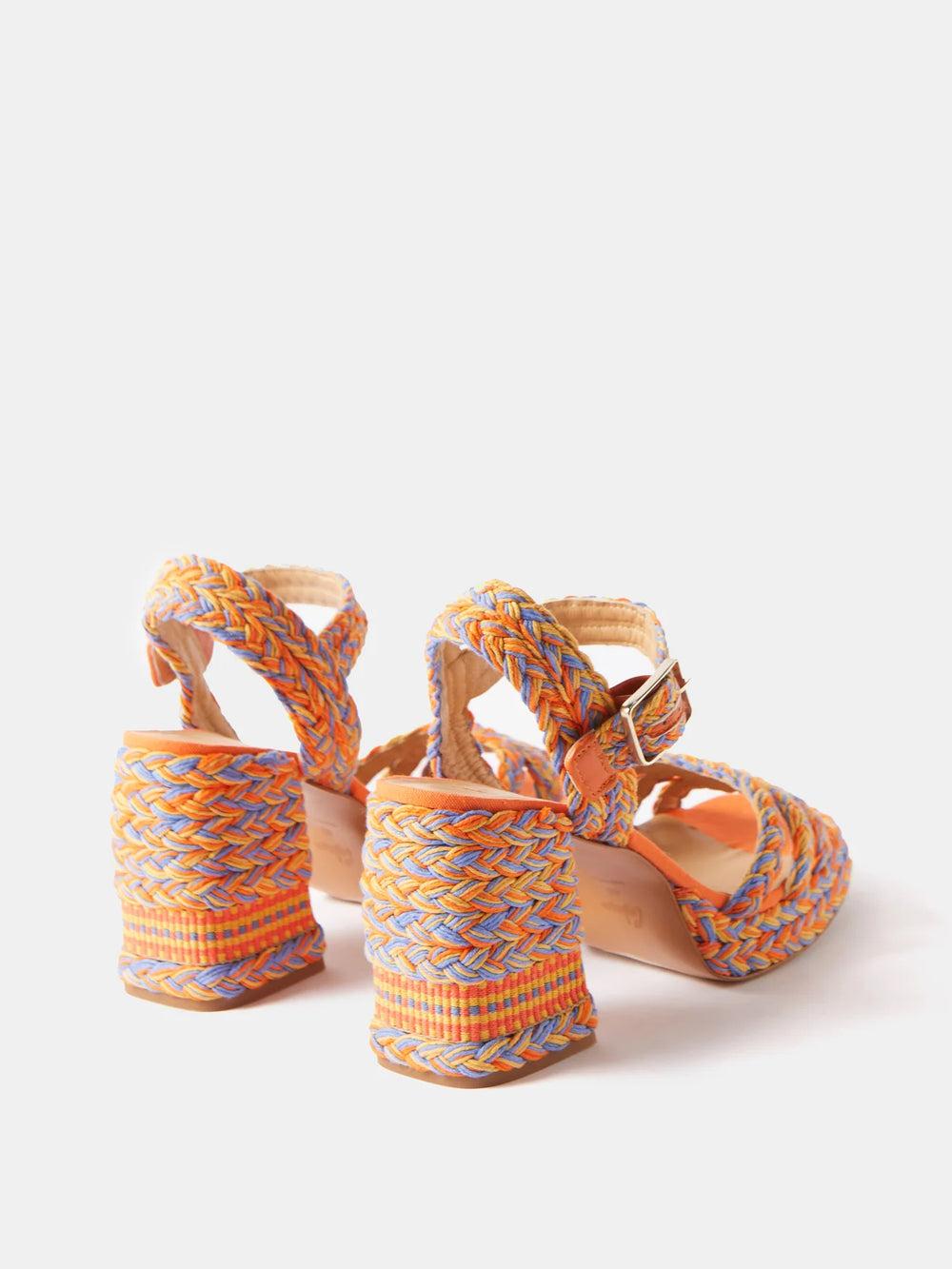Castañer’s orange, blue, and yellow Valeria sandals are braided from faux raffia with a buckled strap and block heel, giving them a retro verve.
