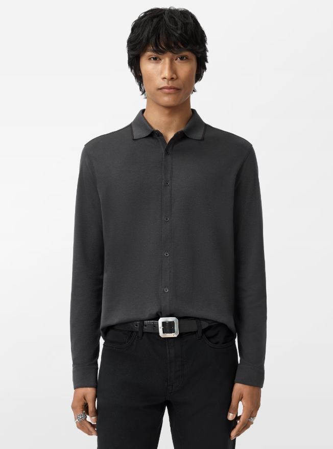 The Drewce Shirt is a refined knit button-up designed with a tipped knit collar and shaped hem. Crafted from birdseye interlock fabric, it combines soft structure with elevated texture. Metal logo buttons run down the center front and cuffs, while a French seam at the back streamlines the silhouette. Finished with functional cuffs and thoughtful detailing throughout.