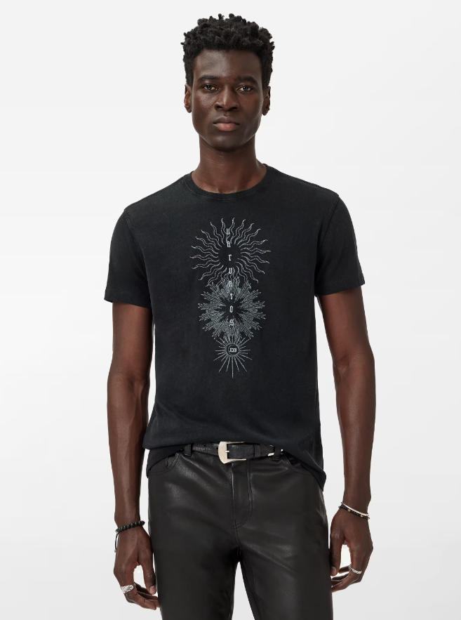 The Varvatos Rays Tee puts a bold spin on a classic crew. Crafted from 100% organic cotton, this short sleeve tee features a vertical arrangement of stylized ray designs, rendered entirely in gunmetal Lurex metallic embroidery. Down the center, “Varvatos” appears in satin stitch embroidery, while “XXV” is stitched at the hem, a nod to our 25th Anniversary celebration.