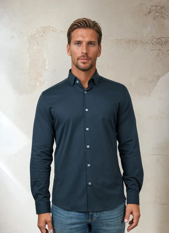 The NOVA - Dark Navy Legacy Shirt from our Nova Collection is designed with an elegant drape and a smooth, peachy finish. Its clean silhouette and modern feel make it a versatile option for both casual and elevated looks.