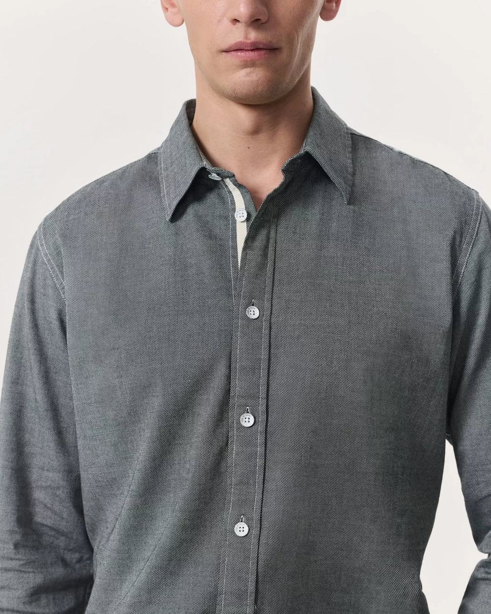 Buttons at center front and cuffs, faux bone button at sleeve placket