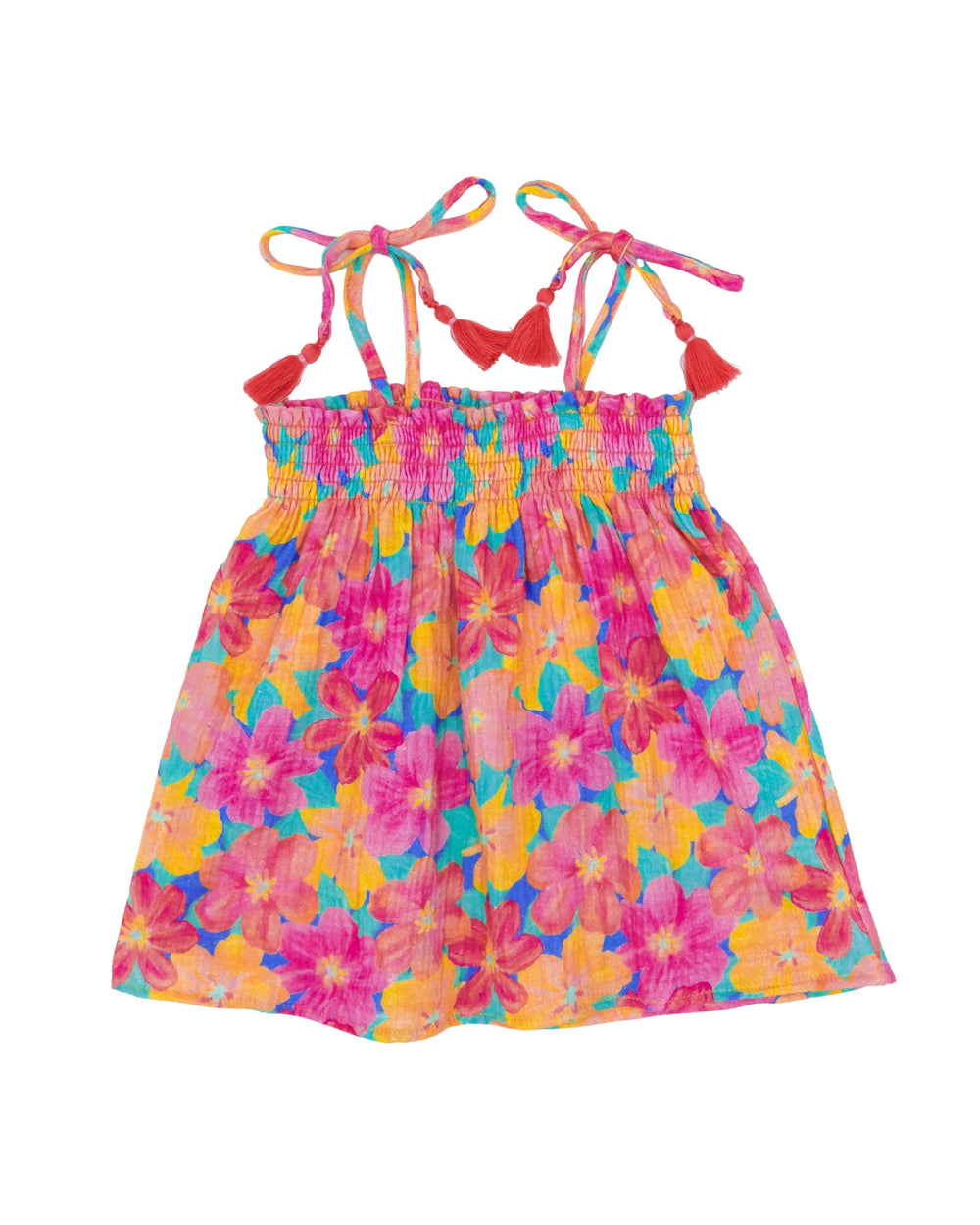 Girl short and tank top set: Top features smocked chest and straps with tassel ties. Shorts have a smocked waistband and ruffle detail at hem.