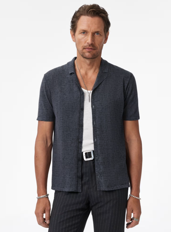 The Nayeem Camp shirt merges thoughtful detailing with a relaxed silhouette. Crafted from 100% organic mercerized cotton, the fabric is overdyed and finished in a soft jersey stitch. A tonal etching print adds quiet visual depth, while angled back shoulders refine the fit. Metal logo buttons secure the front, and a camp collar creates an easy, open neckline.